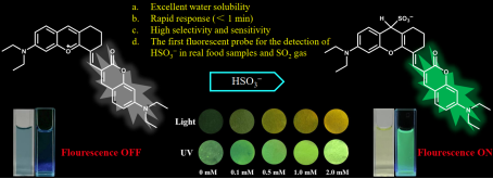 亚硫酸氢盐(HSO3−)具有漂白、防腐、抗氧化、抑制细菌生长、控制食品中酶促反应等功能。然而,长期食用含有过量HSO3−的食品会对健康造成危害。此外,过量的二氧化硫可能引起易感人群的腹泻、低血压、过敏和哮喘反应等。因此,急需探索一种快速、可靠和方便的工具来检测食品中的HSO3−和二氧化硫。我们开发了一种荧光探针NPO用来检测100%水溶液中的HSO3−。探针NPO具有合成简单、水溶性好、比色变化明显、选择性好、灵敏度高、反应快(1分钟内)等优点,成功地应用于试纸条实验,以观察HSO3−和二氧化硫的浓度变化。此外,该探针成功用于检测真实食品样品和动物血清样品中的HSO3−。探针NPO在食品安全领域检测HSO3−方面具有广阔的应用前景。